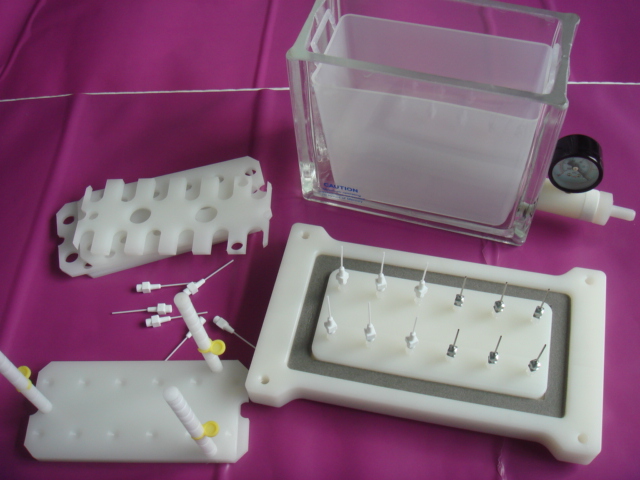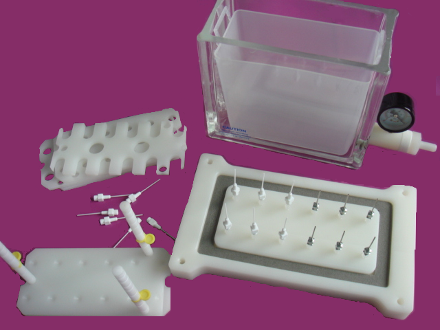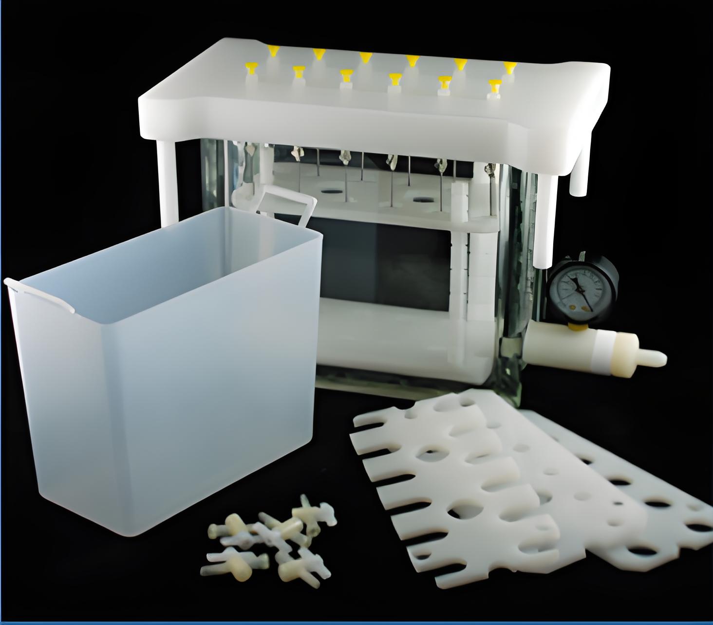 Mediwax固相萃取裝置可實現(xiàn)連續(xù)的樣品萃取和過濾,簡化復雜的樣品預處理過程并節(jié)約時間。整套裝置含有一個透明玻璃槽和頂蓋,可通過抽真空控制樣品流過SPE小柱實現(xiàn)萃取程序。通過調整玻璃槽里面的支架可容納不同規(guī)格的樣品收集管,包括玻璃或塑料試管、自動樣品瓶、容量瓶以及錐形瓶等,洗脫液通過選擇聚丙烯(PP)或不銹鋼導向針以及防交叉污染的特氟?。?/span>Teflon)連接管直接引入樣品收集管。12位裝置附贈一個聚丙烯(PP)廢液槽,用于操作中收集廢液,可簡化樣品處理過程中廢液的處理以及保持玻璃槽內潔凈的環(huán)境。